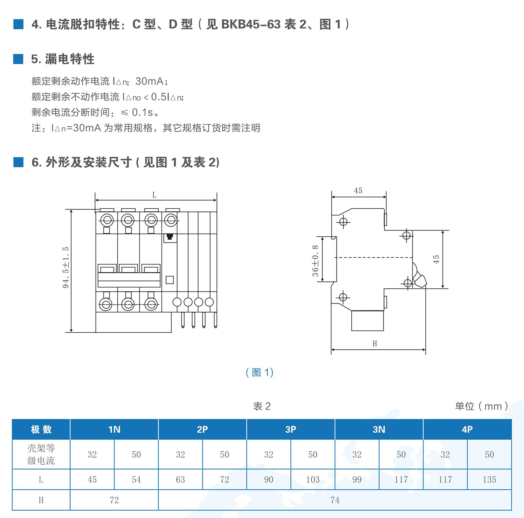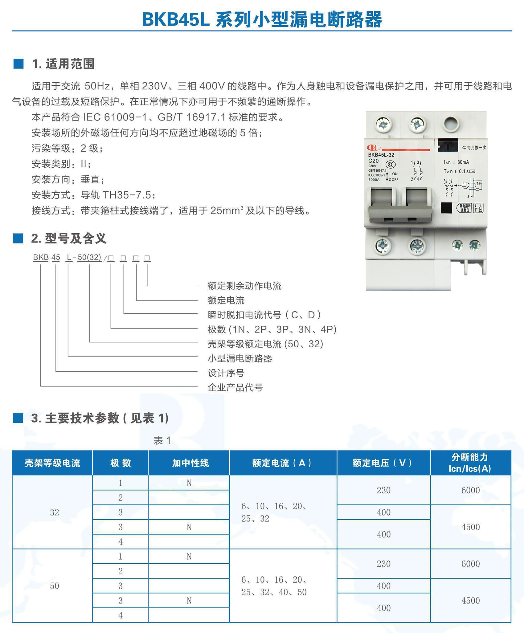 BKB45L-32系列带剩余电流保护小型断路器适用于交流50Hz、额定电压至400V,额定电流6~32A 的线路中。作为人身触电和设备漏电保护之用,并可用于线路和电气设备的过载以及短路保护。在正常情况下亦可用于不频繁的通断操作。本产品符合GB/T 16917.1、IEC 61009-1标准。