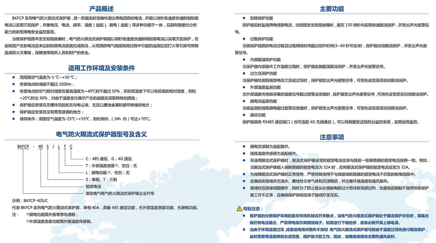 BKFCP系列电气防火限流式保护器,是一款能实时准确检测出用电回路的电流,并能以微秒级速度快速限制短路电流以实现灭弧保护,并集电压、电流、频率、温度(选配)、漏电(选配)等多种功能于一体,且具有智能化分析能力的新型用电安全监控装置。当被保护线路中发生短路故障时,电气防火限流式保护器能以微秒级速度快速限制短路电流以实现灭弧保护,在由短路产生的电流远未达到短路电流前就完成限流,从而预防电气线路短路过程中引起的连续拉弧打火等引燃可燃物造成的火灾事故,保障使用场所人员和财产的安全。